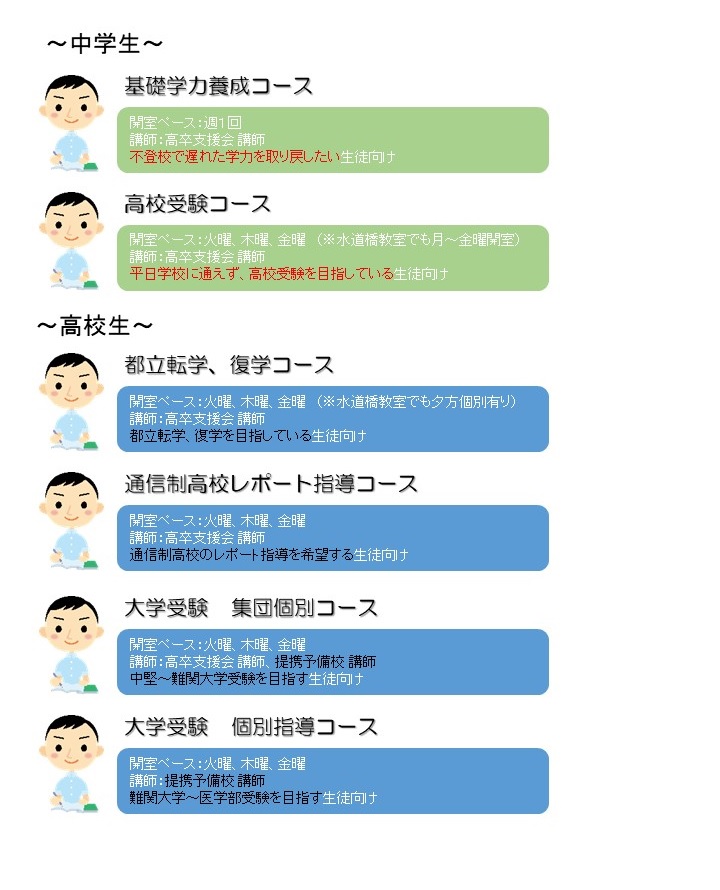 自習室利用、高校の基礎講座、大学受験対策、個別指導 子ども達が求めるニーズお応えしますのでお気軽にお問い合わせ下さい。