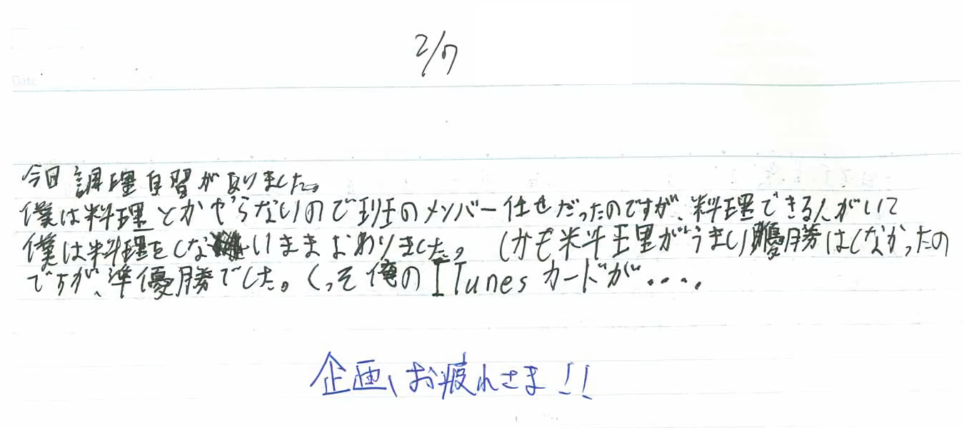 僕は料理とかやらないので班のメンバー任せだったのですが、