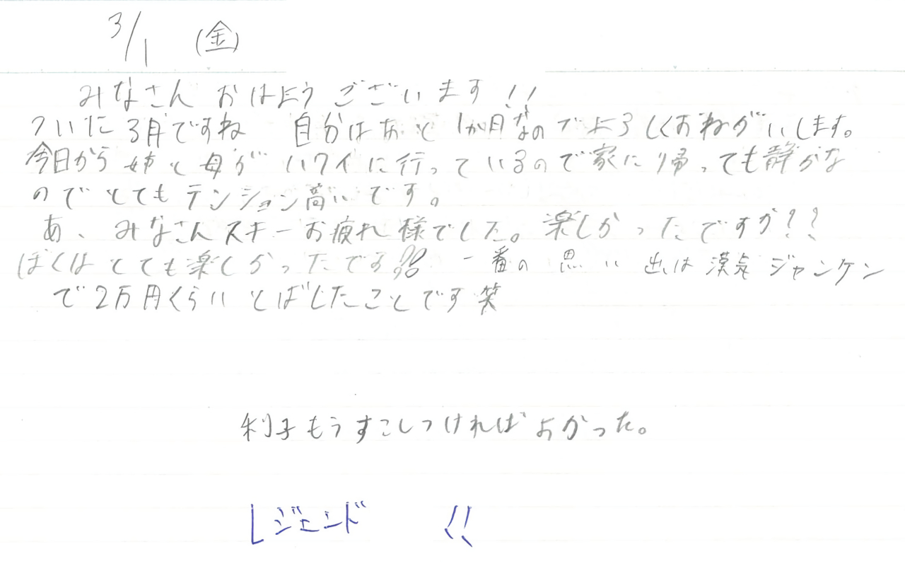 あ、みなさんスキーお疲れ様でした。楽しかったですか!?ぼくはとても楽しかったです!!