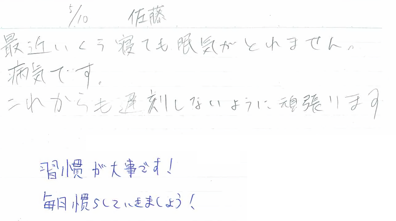 不登校塾・フリースクール 不登校中学・高校生の交換日記 @東京都新宿エルタワー・水道橋 その194 2026 4/03 \ SNSも随時更新中 / 子どもが輝く東京・応援事業相談 無料相談はこちら お電話でのお問い合わせ MENU まずは話をきいてみる 電話でのお問い合わせ 資料請求 寄付でのご支援 子供が輝く東京・応援事業相談 フリースクール通信制高校ご案内 フリースクールについて 通信制高校サポート校について オンラインコース eスポーツコース プログラミングコース 就労支援コース 英会話・海外留学コース 寮生活サポート 在校生の声 卒業生の今 アウトリーチ支援[家庭訪問カウンセリング] キャンパス 料金について ご入会案内・資料請求 お知らせ一覧 イベント一覧 BLOG 理事長ブログ一覧 不登校支援スタッフブログ一覧 保護者交流だより一覧 高卒支援会だより一覧 会長コラム一覧 各種お問い合わせ 高卒支援会について 団体概要 年次報告 メディア出演 スタッフ紹介 出版書 合格・進路実績 協力団体 理事長・会長あいさつ 保護者会 採用情報 [冒頭文] 2019年5月10日(金) S君 最近いくら寝ても眠気がとれません。病気です。 これからも遅刻しないように頑張ります。 ・習慣が大事です!毎日慣らしていきましょう! [文末(水道橋用)] 理事長ブログ き こ た も り る ェ ワ ー 不 中 京 人 会 信 制 卒 合 同 孝 学 宣 宿 引 援 支 新 明 杉 東 校 橋 水 法 浦 生 登 説 通 道 都 高 閉じる