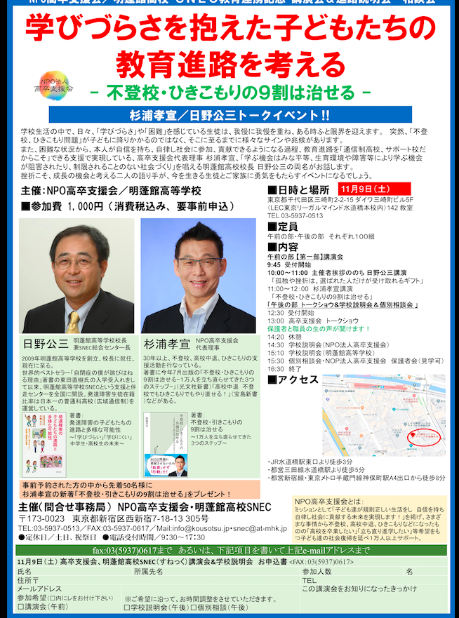 当日は講演会・トークショー・ひきこもりを脱けた子達の話も聞けます。是非、ご参加を!