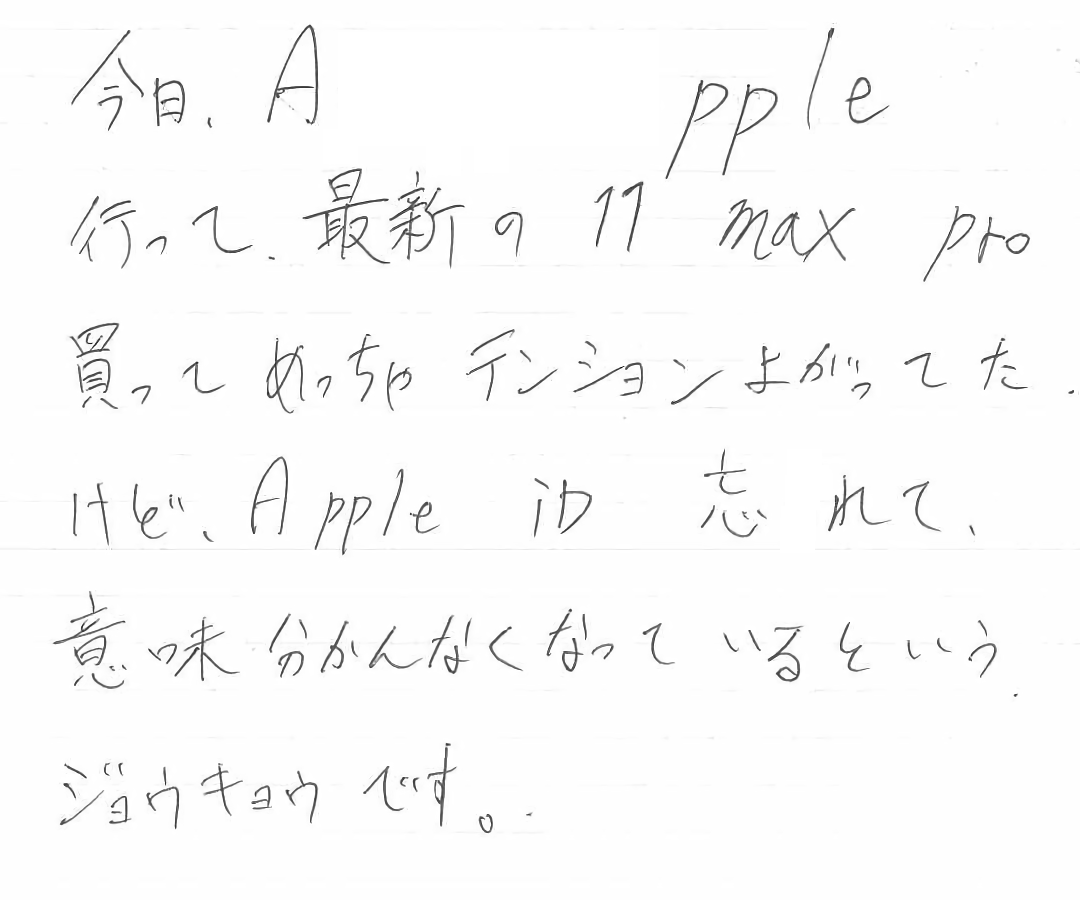 今日、Apple行って、最新の11 Pro Max買ってめっちゃテンションあがってたけど、Apple ID忘れて意味わかんなくなってるというジョウキョウです。