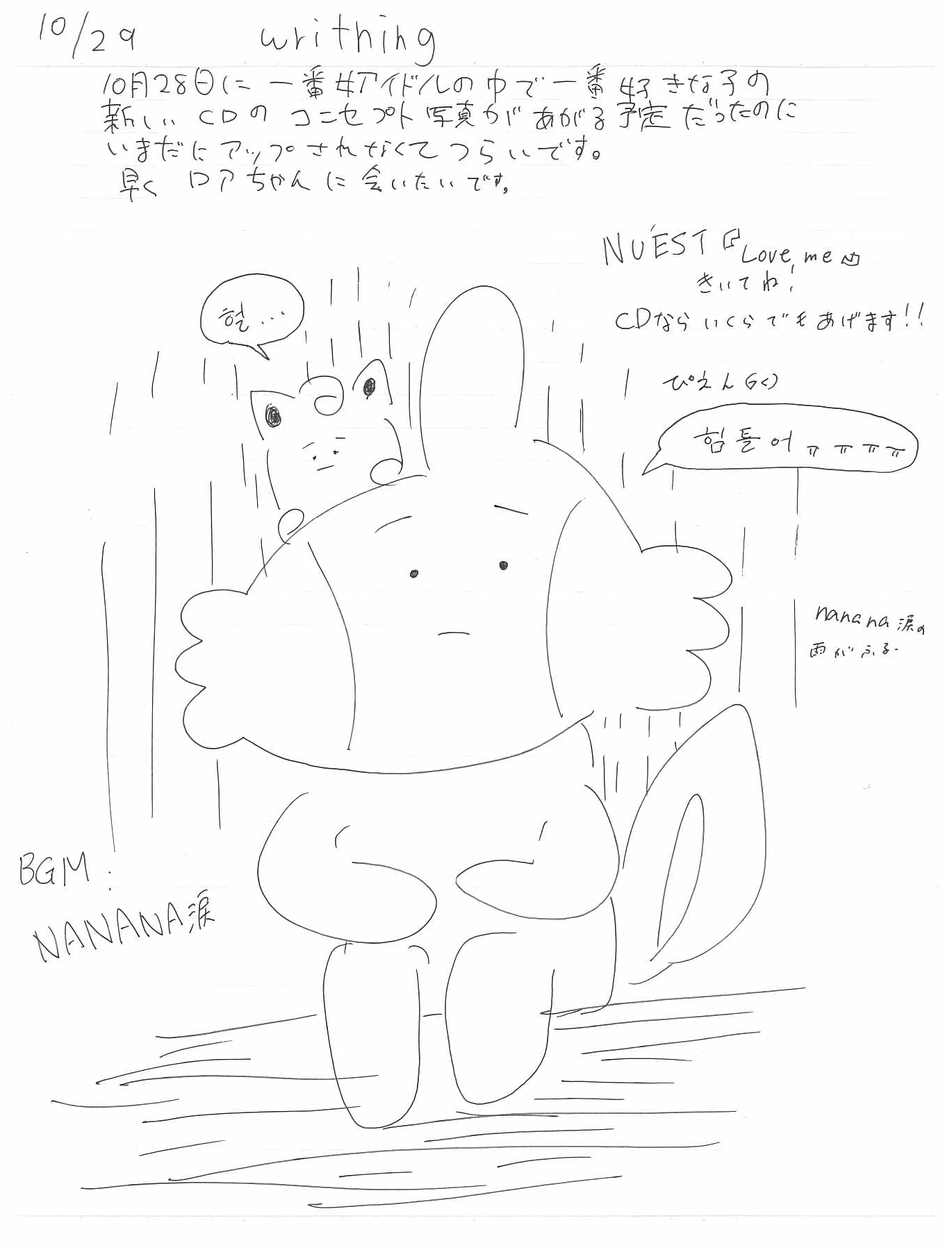 10月28日に一番女アイドルの中で一番好きな子の新しいCDのコンセプト写真が上がる予定だったのに未だにアップされてなくてつらいです。早くロアちゃんに会いたいです。