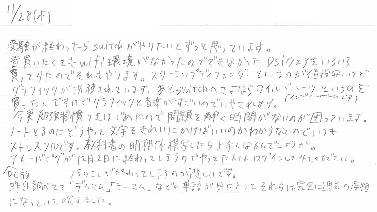 昔買いたくてもWiFi環境がなかったのでできなかったDSiウェアを色々買ってみたのでそれもやります。スターシップディフェンダーというのが値段安いけどグラフィックが洗練されています。あとSwitchのさよならワイルドハーツ(インディーゲームです)というのを買ったんですけどグラフィックと音楽がすごいので癒やされます。