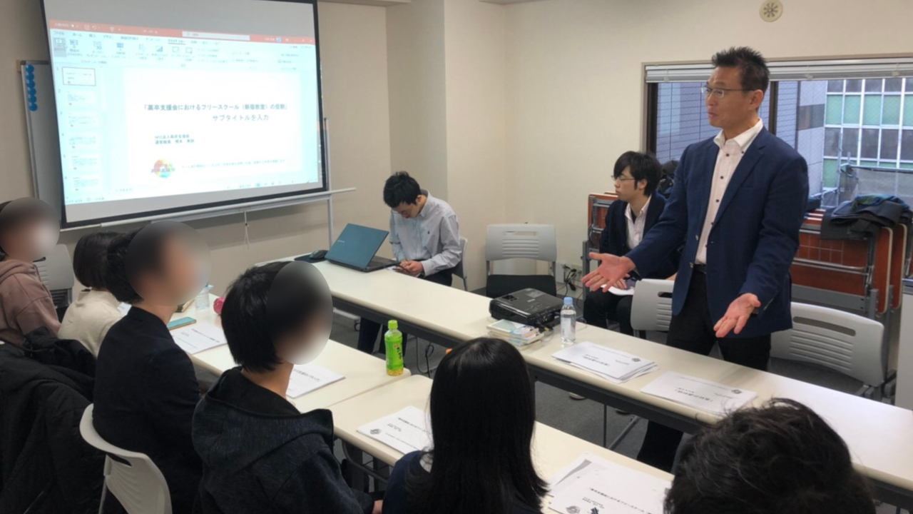 高卒支援会が運営するフリースクールの特長や現状、出席率などのデータを提示してくださいました。