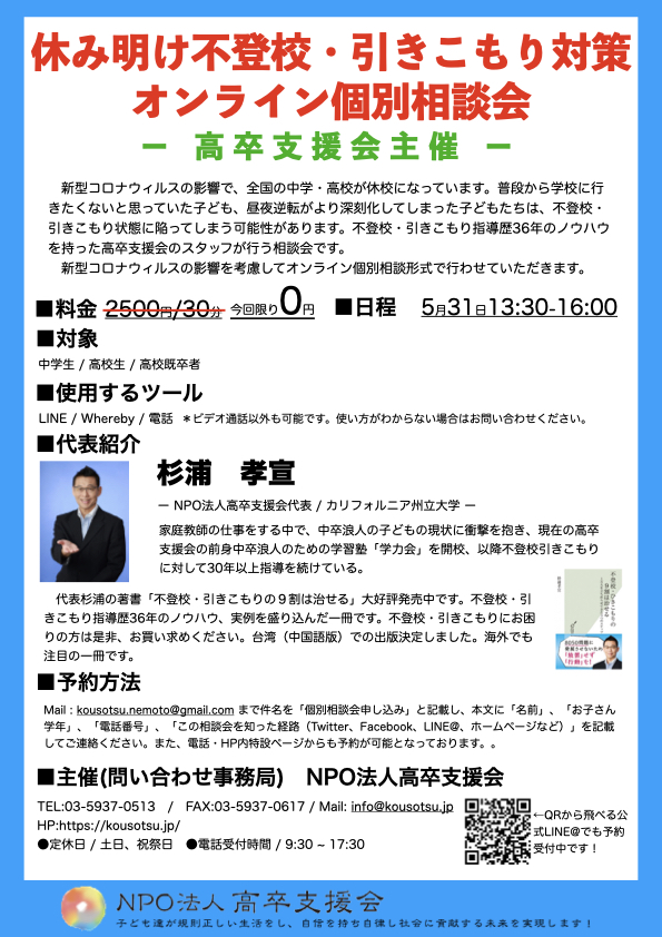 不登校・引きこもり対策のオンライン個別相談会を5月31日に実施致します。