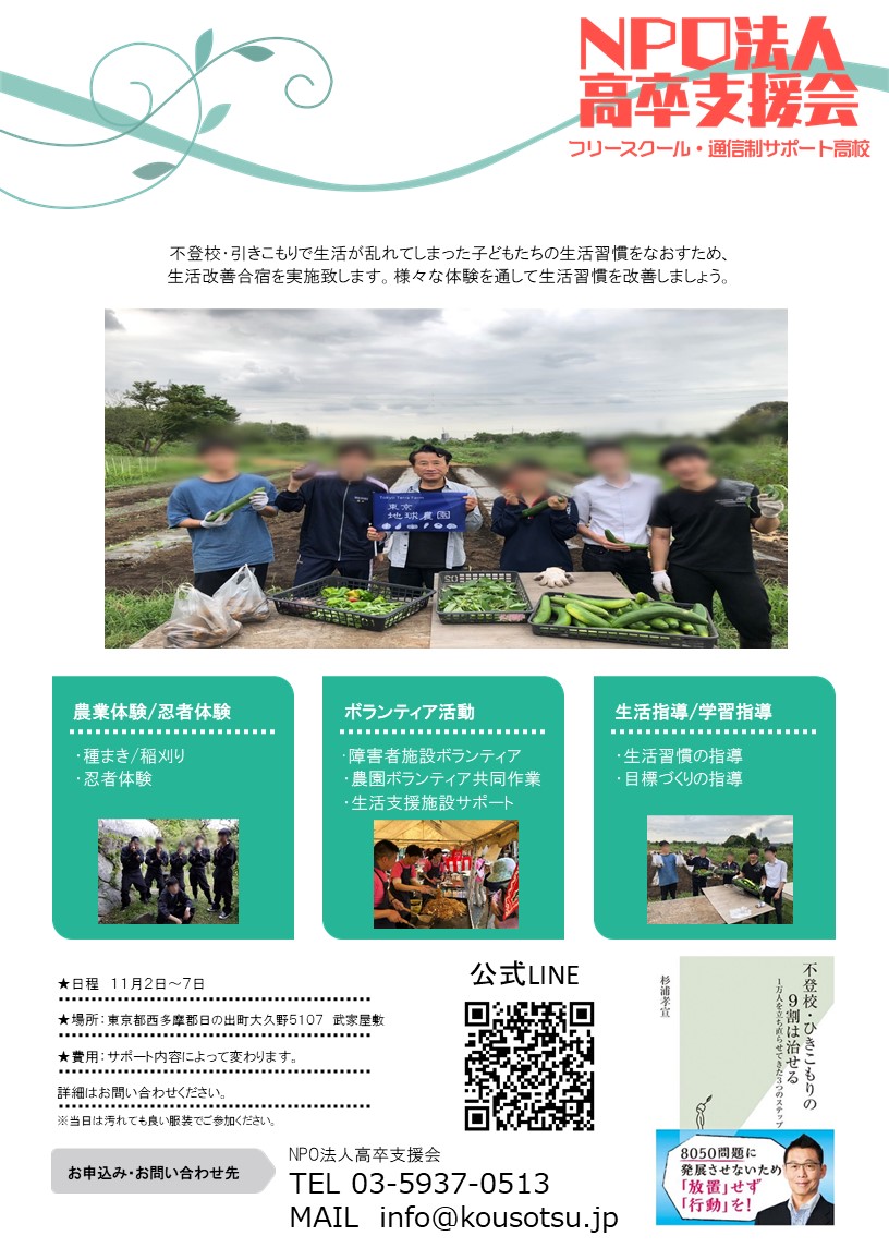 各新宿、池袋、横浜、水道橋教室にて不登校、引きこもり、転学・編入学、通信制サポート校、フリースクールの相談を承っております!お気軽にお問い合わせください。 不登校,引きこもり支援の日常、よくある相談にお答えするNPO法人高卒支援会の公式youtubeチャンネル登録、高評価のほう宜しくお願いします! noteにて、不登校・引きこもりの、支援の正しいありかた・予防法を発信します!