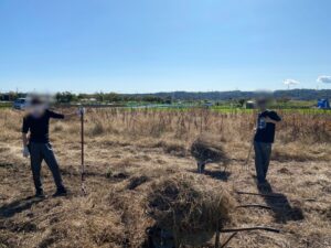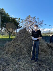 2人とも朝から農作業に奮闘。枯れ草を一輪車で運ぶ作業。決して重労働ではないが、昼夜逆転の生活からお日様の下に戻った2人には過酷な作業だったようです。