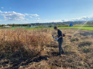 もう一人の参加者のA君は一人で奮闘。草刈り機にも挑戦。