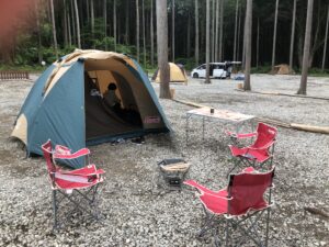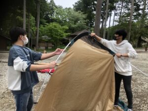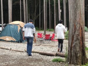 O君はキャンプを結構されているそうで、M君と私に教えながらスムーズに設営できました。途中でわからないところがあり、駐在管理員の方に聞きましたが2人とも頑張ってくれましたよ~。M君は初めてのキャンプ設営でしたが、面倒臭がらずに手伝ってくれました。ただ、はいとしか反応しないのでもっと嚙みついてもいいんだよと思っていました。