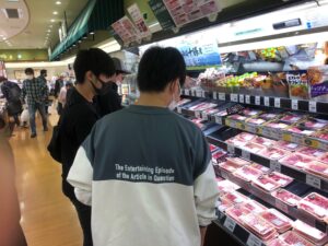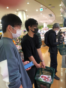初日は2人に任せた方が良いと思い、見守っていました。O君はバンバン買いたい物を入れていくのですが、M君はレシピを見ながら考えているようです。二択にすると選べるのですが、自分から選ぶのが難しいらしく、まずはレシピを決めてやりなさいといってもできない様です。