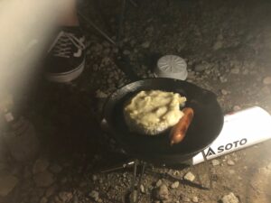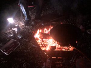 キャンプといえば、やはりキャンプ飯!初日のキャンプ飯は結構、ハードでした。フライパンの取っ手を忘れてしまって、ガックシしました。スーパーでO君がバンバン買ったものをジュージュー焼いていっていきました。
