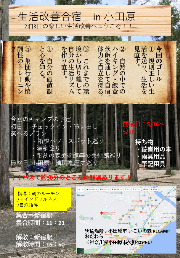 大学生インターンの飯島です。今回、生活改善合宿のキャンプは私が引率したので報告をさせていただきます。