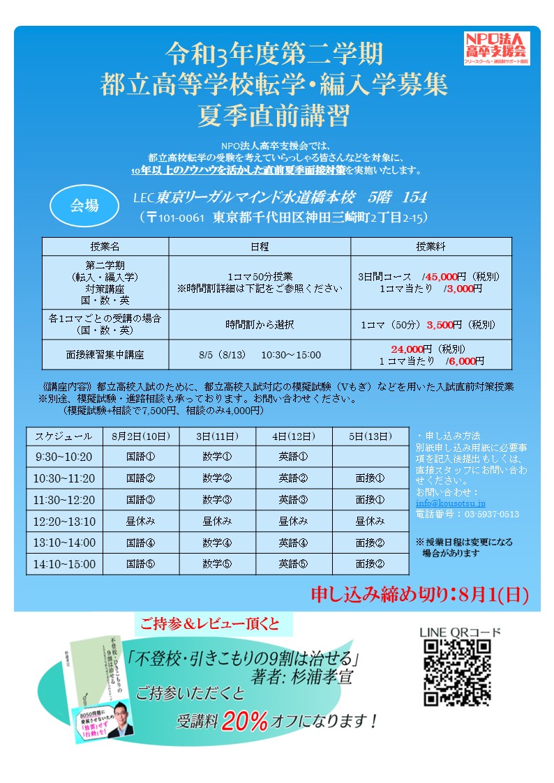 『令和3年度第二学期都立高校転学・編入学募集』を受験する方向けの夏期直前講習を実施致します。