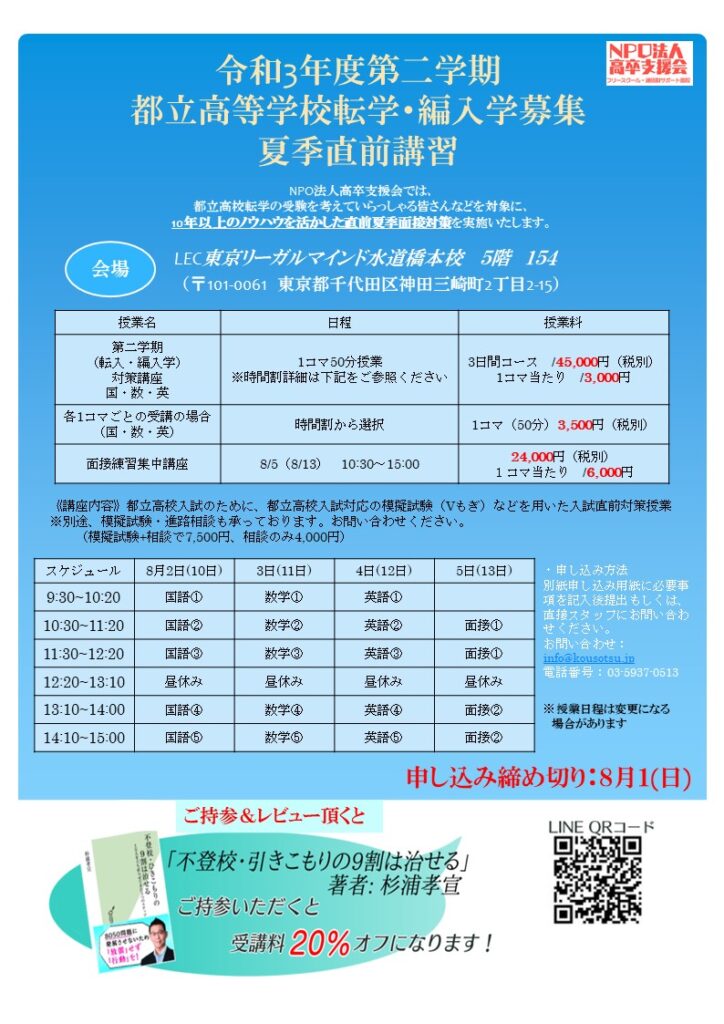 令和3年度第二学期 都立高校学校 転学・編入学 夏季直前講習 8月10日~13日 受付中