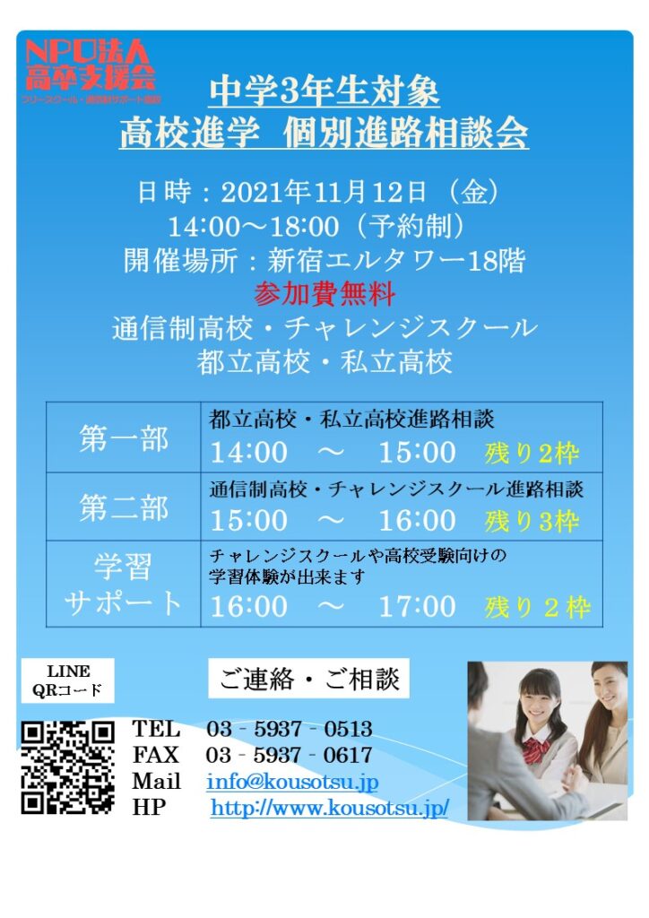 不登校・ひきこもりの中学3年生の進路個別相談会を11月12日(金曜日)に新宿で行います。