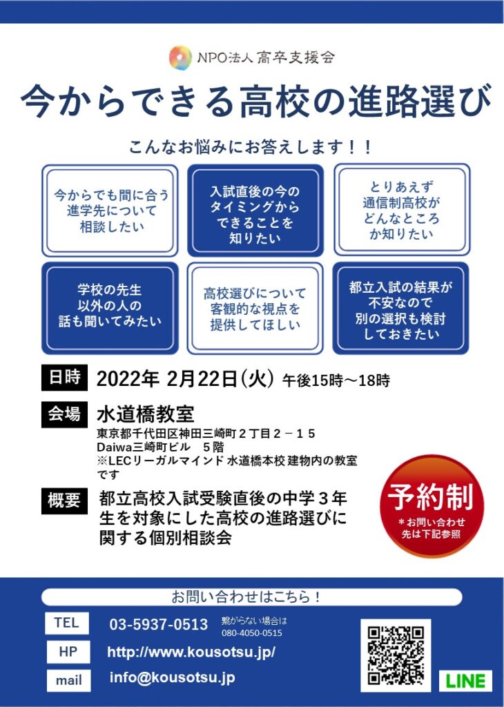 今からできる高校の進路選び 2月22日個別相談会実施