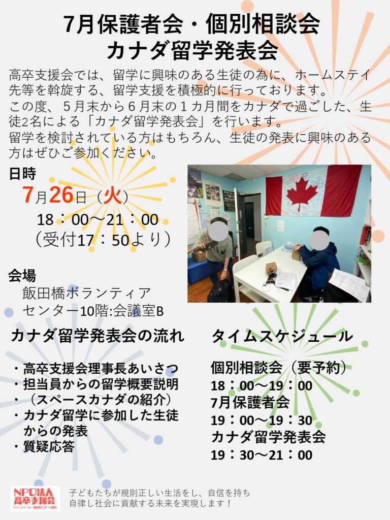 今日は、「通信制高校から留学 7月26日在校生によるカナダ留学発表」というテーマでお話をしたいと思います! 本題に入る前にお知らせをさせてください。