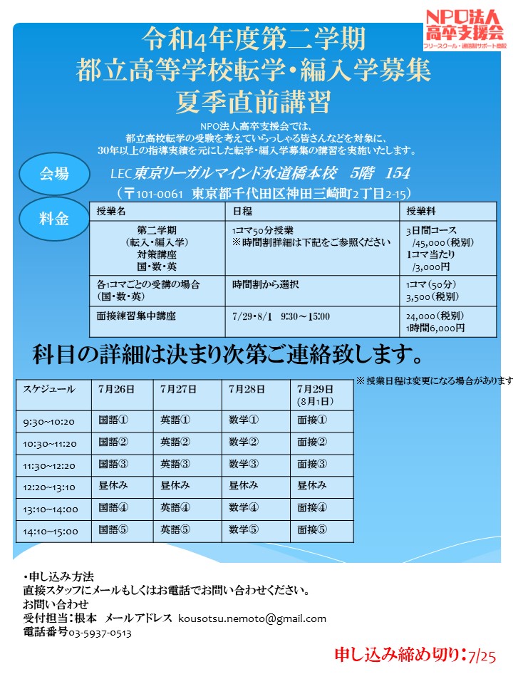 今日は、「令和4年度第二学期都立高等学校転学・編入学募集 直前講習」というテーマでお話をしたいと思います! 本題に入る前にお知らせをさせてください。