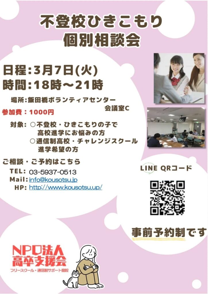 不登校・引きこもりについてはもちろん、中退・留年・転学・編入・学業不振・非行・発達障害など様々なお悩みの方からのご相談をいただいています。予約フォームの入力をしていただくと面談のご予約ができます。
