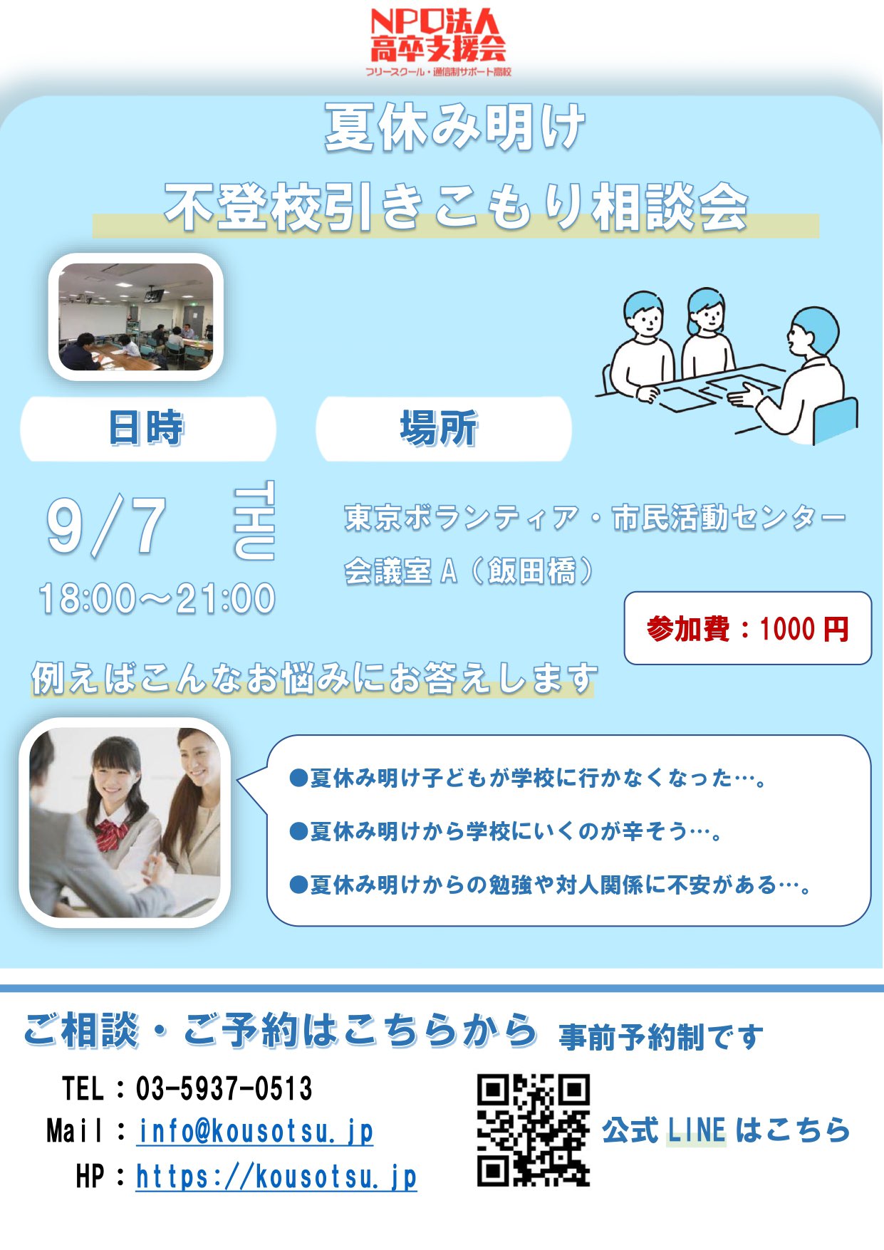 9月7日木曜日18時~21時 夏休み明け 不登校・ひきこもり個別相談会