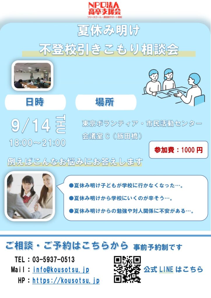 全国の中学生、高校生の不登校や長期引きこもりに至るまでのご相談を承っております。