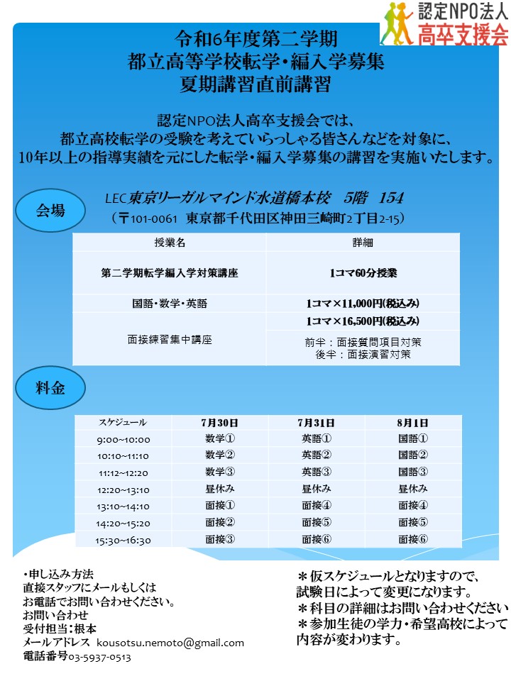 夏期講習では転学に向けた対策を実施いたしますが、人数の都合上、定員が埋まり次第締め切りをさせていただきますのでお早めにご相談ください。