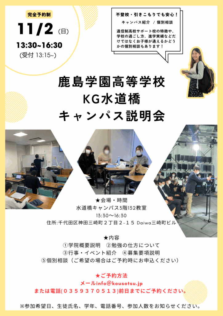 11月2日 鹿島学園水道橋連携キャンパス 学校説明会 2026 4/03 \ SNSも随時更新中 / 子どもが輝く東京・応援事業相談 無料相談はこちら お電話でのお問い合わせ MENU まずは話をきいてみる 電話でのお問い合わせ 資料請求 寄付でのご支援 子供が輝く東京・応援事業相談 フリースクール通信制高校ご案内 フリースクールについて 通信制高校サポート校について オンラインコース eスポーツコース プログラミングコース 就労支援コース 英会話・海外留学コース 寮生活サポート 在校生の声 卒業生の今 アウトリーチ支援[家庭訪問カウンセリング] キャンパス 料金について ご入会案内・資料請求 お知らせ一覧 イベント一覧 BLOG 理事長ブログ一覧 不登校支援スタッフブログ一覧 保護者交流だより一覧 高卒支援会だより一覧 会長コラム一覧 各種お問い合わせ 高卒支援会について 団体概要 年次報告 メディア出演 スタッフ紹介 出版書 合格・進路実績 協力団体 理事長・会長あいさつ 保護者会 採用情報 11月2日(日曜日)13時30分~16時30分 鹿島学園高等学校水道橋連携キャンパスの学校説明会を実施いたします!鹿島学園入学検討している方、通信制高校について相談したい方、不登校・引きこもりについてお悩みの方是非ご参加お待ちしております! 理事長ブログ KG高等学院 通信制高校 通信制高校サポート校 鹿島学園 閉じる