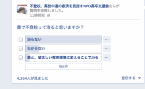 毎日暑いですね。 今、facebook上で「不登校って薬で治るの?」というアンケートをしてます。