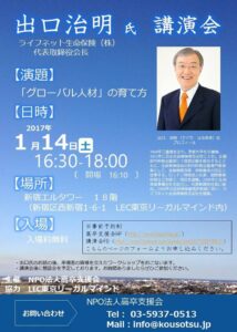 114日 ライフネット生命の出口会長の講演 「グローバル人材の育て方」とそのご、ワークショップを新宿エルタワー18Fで開催します。