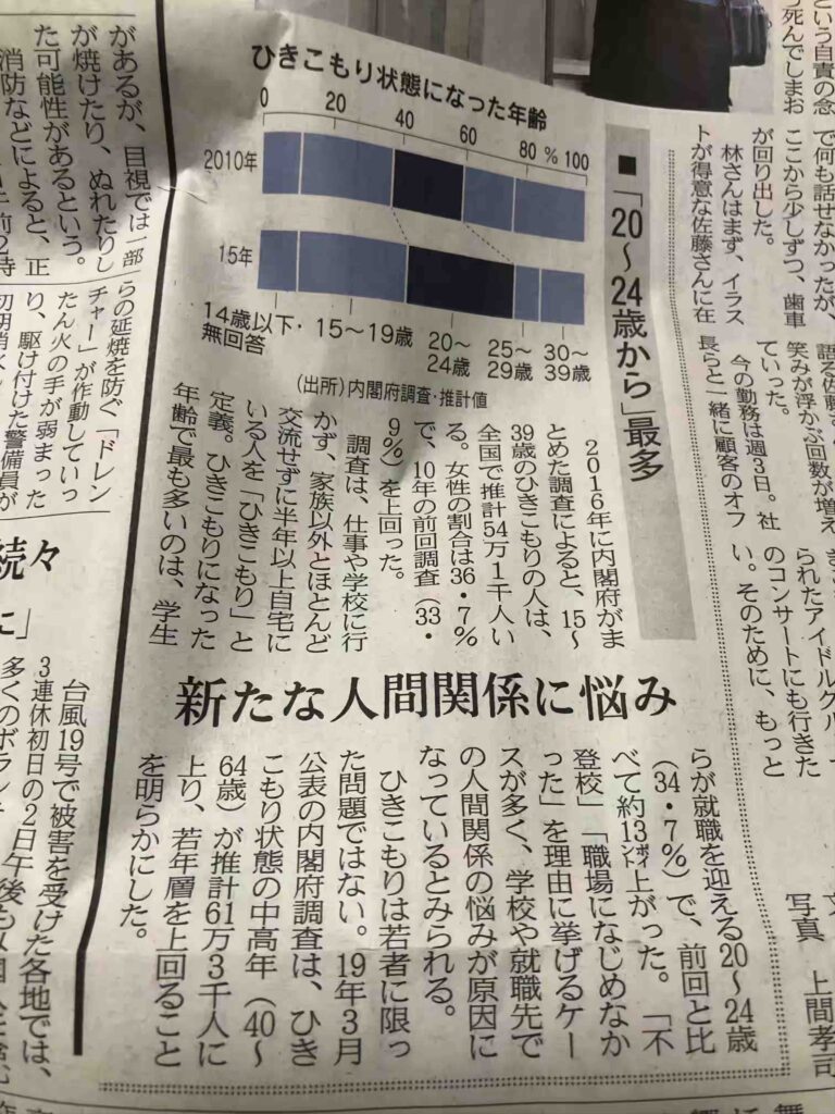 「まず、断っておきますが、僕らの団体は二十歳前後で不登校・高校中退・引きこもりで悩んでいる方の支援団体であり、大人の方はやったことがないのでわかりませんが、以前、東京都主催の講演会に招かれましたが、そこに出席している方々は70歳〜80歳の方々が100〜200名くらい集まっていました。本人は来ず、悩みを共有しているだけで、解決する道が見つからないといった様子でした。僕はあれを見て思いました。この年齢まで引きこもりを放置していると全く、解決策がないのではないかって!? 思いました。」