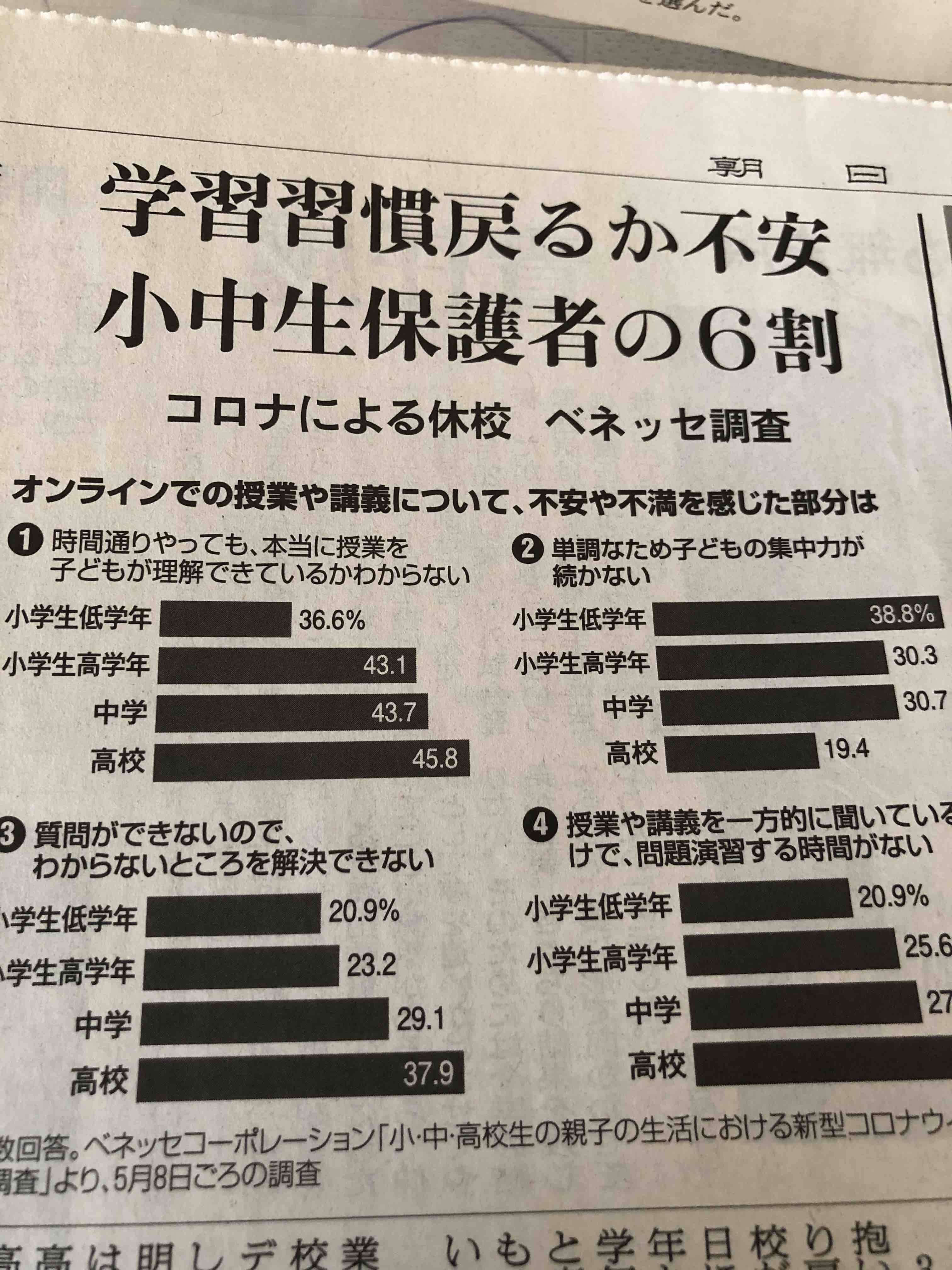オンライン双方向の授業を実際やった、問題点など共有しました。 そもそも、我が国は双方向のオンライン学習システムの普及率は5%だそうです。 コロナの状況下で、学習を取り戻すのは大変ですよね。文科省は学習の遅れはご自宅でやって下さいねという方針らしいですから、義務教育って、どうでしょうか? 下記は朝日新聞抜粋