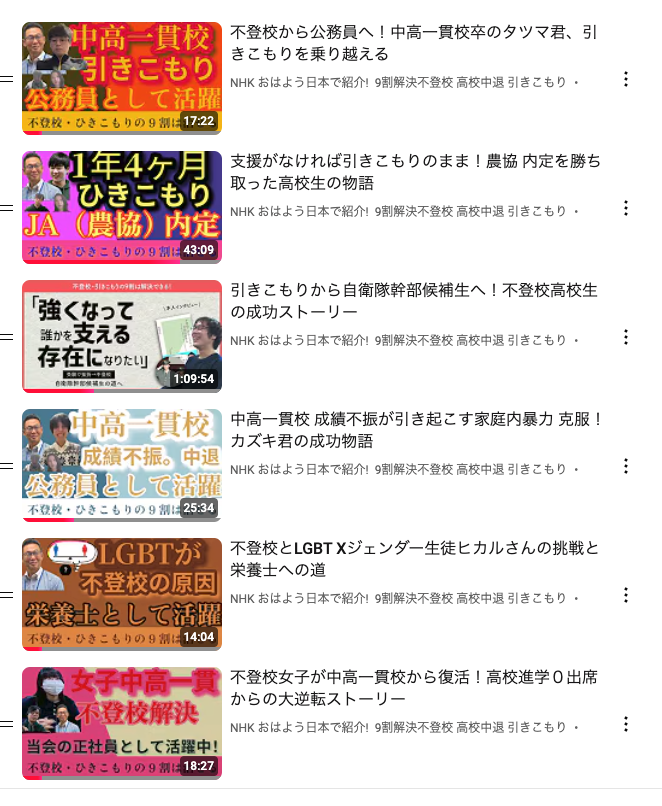この動画「6年後 不登校 ひきこもりの9割は治せる! 支援が無ければ引きこもる」では、私・杉浦孝宣が、長年の支援活動を通じて、どのようにお子さんが変わり、成長していったのかを紹介しています。不登校や引きこもりの問題に直面している方々に、支援の力を信じて勇気を持ち、再出発の第一歩を踏み出していただくための内容です。