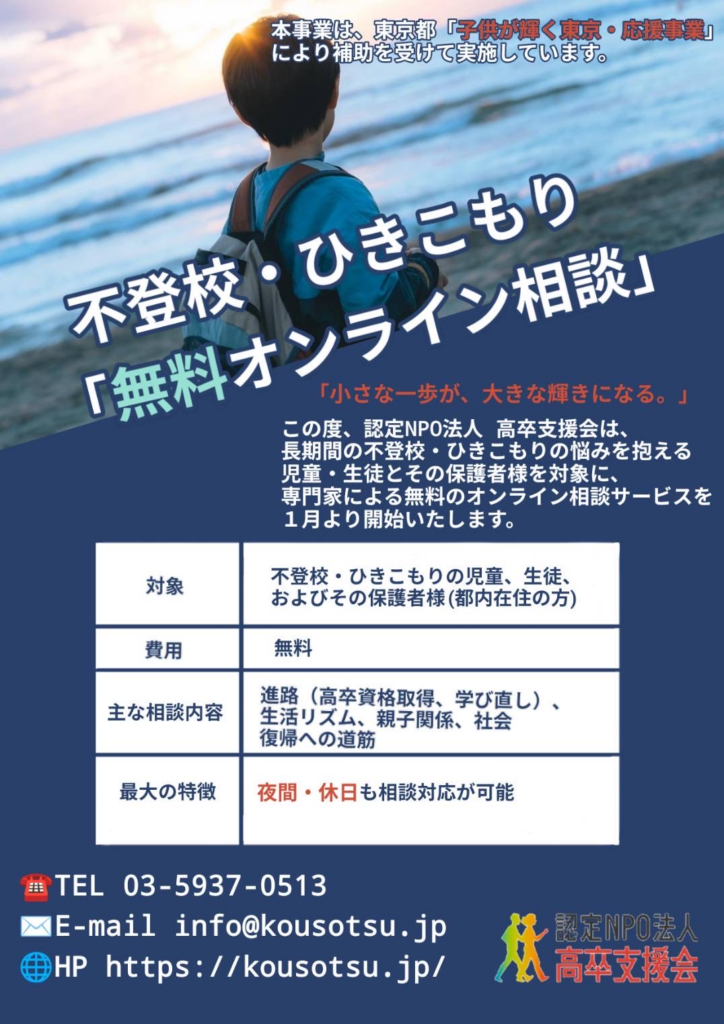 不登校・ひきこもりのご家庭向け 無料オンライン相談 1月より開始します。