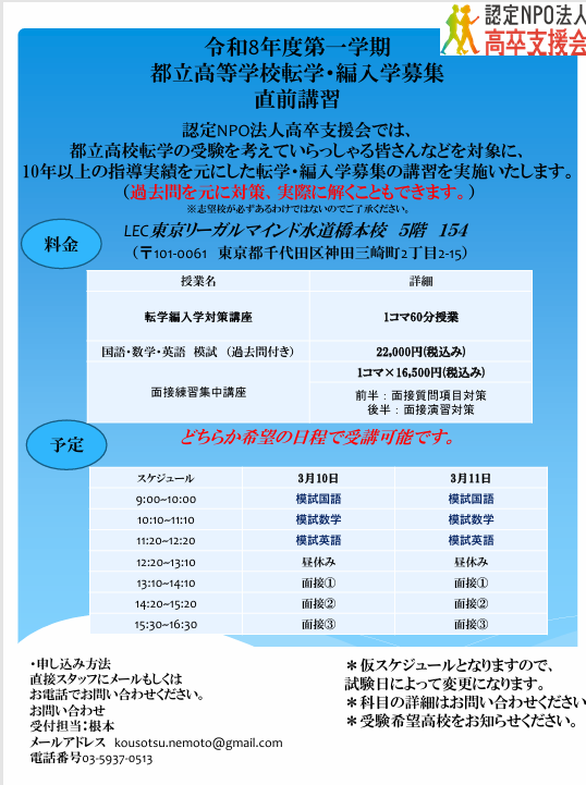 令和8年度 第1学期(4月入学)の都立高校 転学・編入試験がいよいよ近づいてまいりました。 「今の高校が合わない」「環境を変えて再スタートしたい」「一度高校を中退したが、もう一度都立高校で学びたい」と考える皆さんのために … 【令和8年度 第1学期】都立高校 転学・編入学試験「直前講習」開催のお知らせ(過去問対策・面接指導)